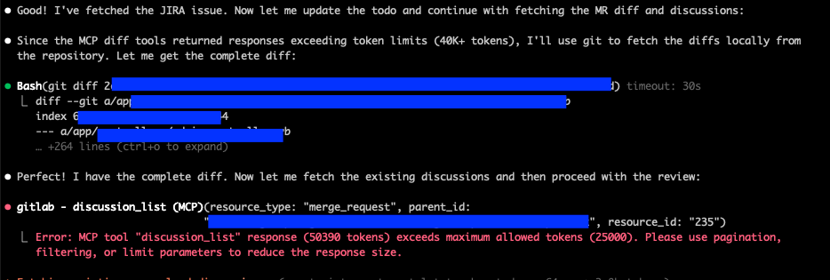Solution: We set export MAX_MCP_OUTPUT_TOKENS=XXXXX to cap token usage while still getting enough context. We also optimized which data we actually needed to pull, avoiding unnecessary full-file reads when only specific sections changed.